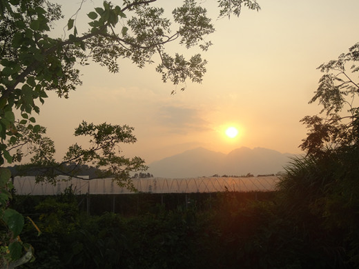 图为夕阳下的大棚风景