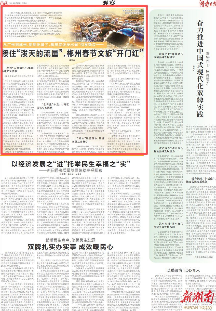 线下,八方游客如潮水般涌向郴州——据统计,2026年春节假期郴州市全域接待游客592.9万人次,旅游总花费37.3亿元,同比分别增长12%和27%,文旅市场呈现“供需两旺、结构优化、体验升级”的蓬勃态势。从有“流量”到有“质量”、从聚“人气”到聚“人心”,郴州这座近年快速崛起的网红旅游城市,稳稳接住这波“泼天的流量”,完成了从吸引关注到口碑传播的“关键一跃”。