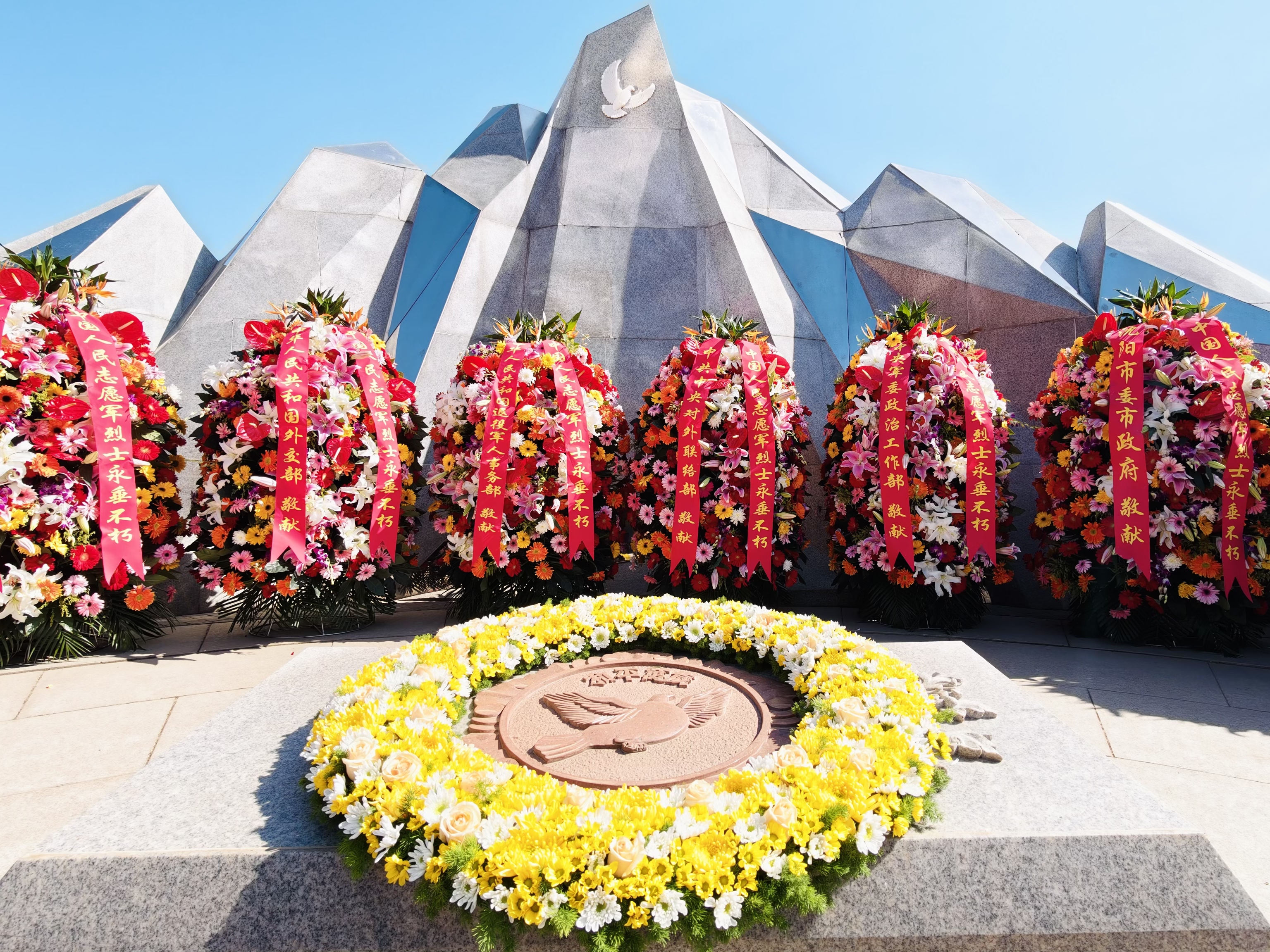 陵园下沉式纪念广场的环形烈士英名墙下,摆满了黄白相间的菊花。参加仪式的人们列队整齐,肃穆站立。从十二方棺椁,到如今长眠于此的1023位英魂,这背后,是上千家庭、几代人的望眼欲穿。