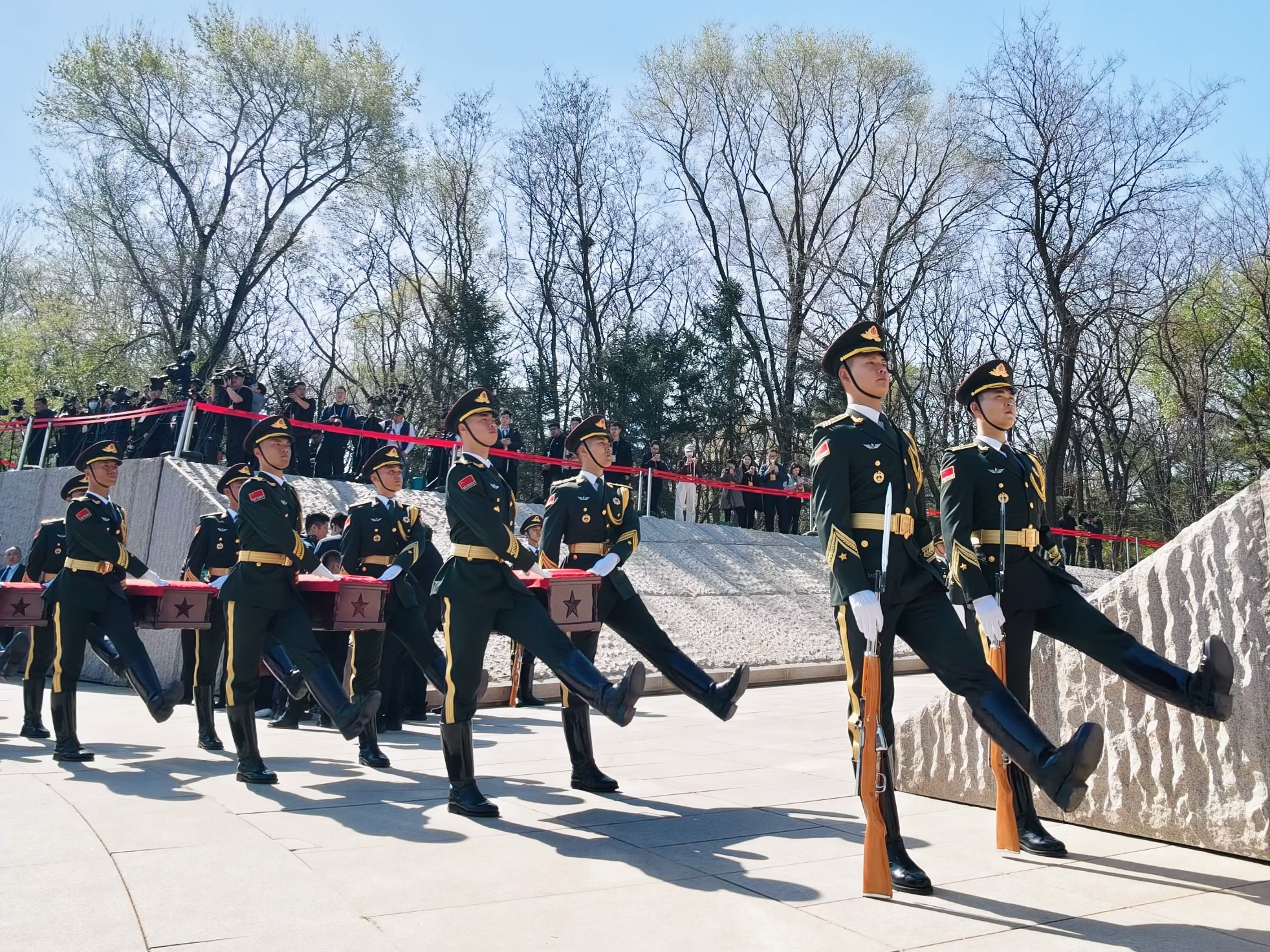 礼兵护送志愿军烈士遗骸棺椁缓步进入纪念广场。朱丽萍 摄