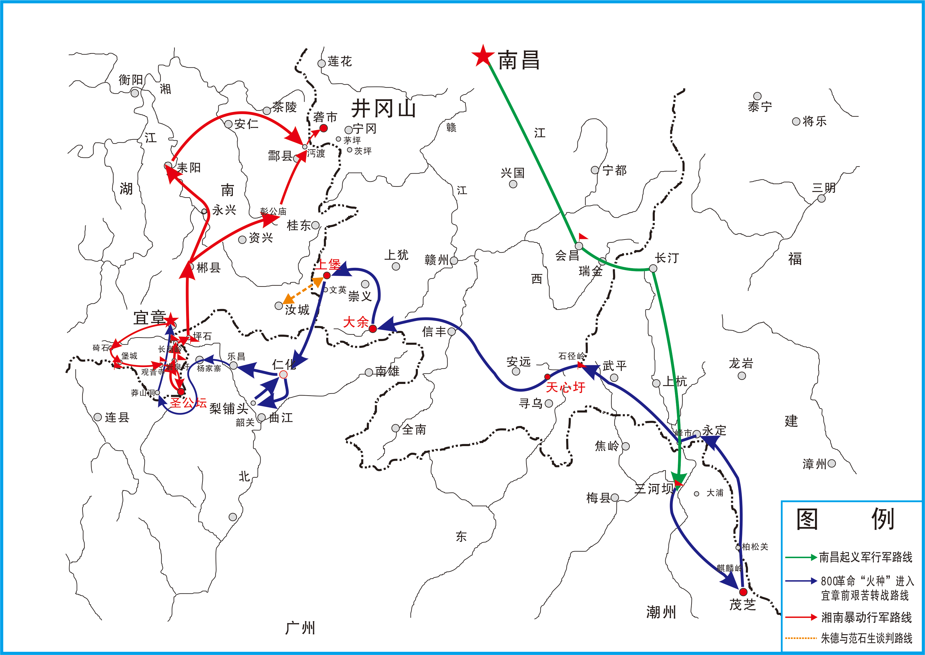 朱德、陈毅率南昌起义军余部挺进湘南、会师井冈山行军示意图