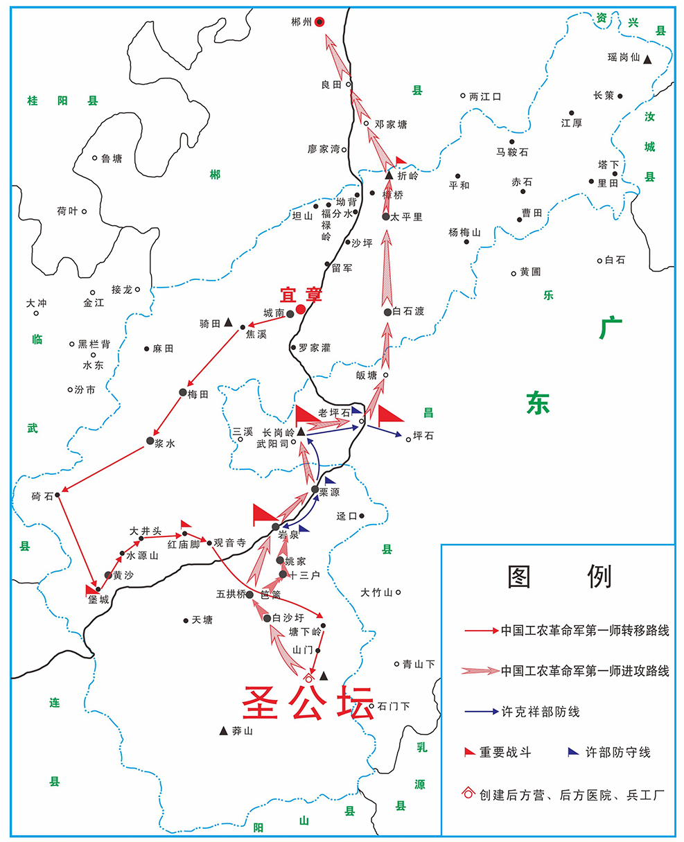 工农革命军第一师和宜章农军第一连从圣公坛出兵取得“岩泉-坪石”大捷示意图