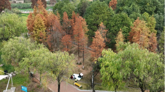 宜章新闻网站讯(记者 李永东 艾学杰)时值初冬,郴州宜章梧塘湖公园层林尽染、色彩斑斓,渐红的水杉,金黄的银杏,翠绿的垂柳,从空中俯瞰,连片彩林依湖而植,错落有致,色彩斑斓的湖景宛如打翻了的调色盘。众多市民来到户外,或席地而坐,或沿湖散步,乐享冬日暖阳,人与自然风光相映成趣、和谐如画,大家在休闲娱乐中,感受着初冬时节的别样魅力。
